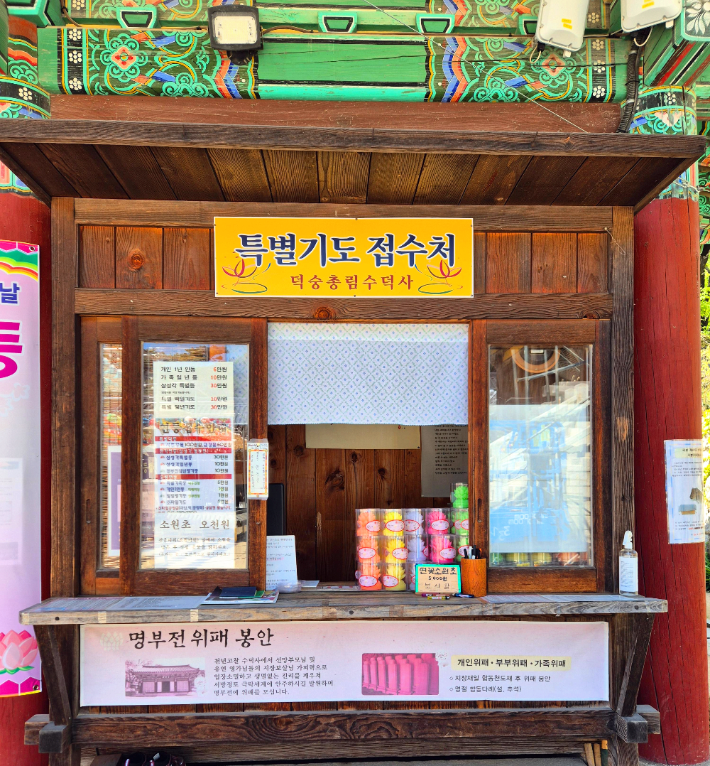그 다음에 가장 높은 곳에 올라가시면 특별기도 접수처가 있는데, 이곳에서 다양한 연등과 초를 올릴 수 있습니다.