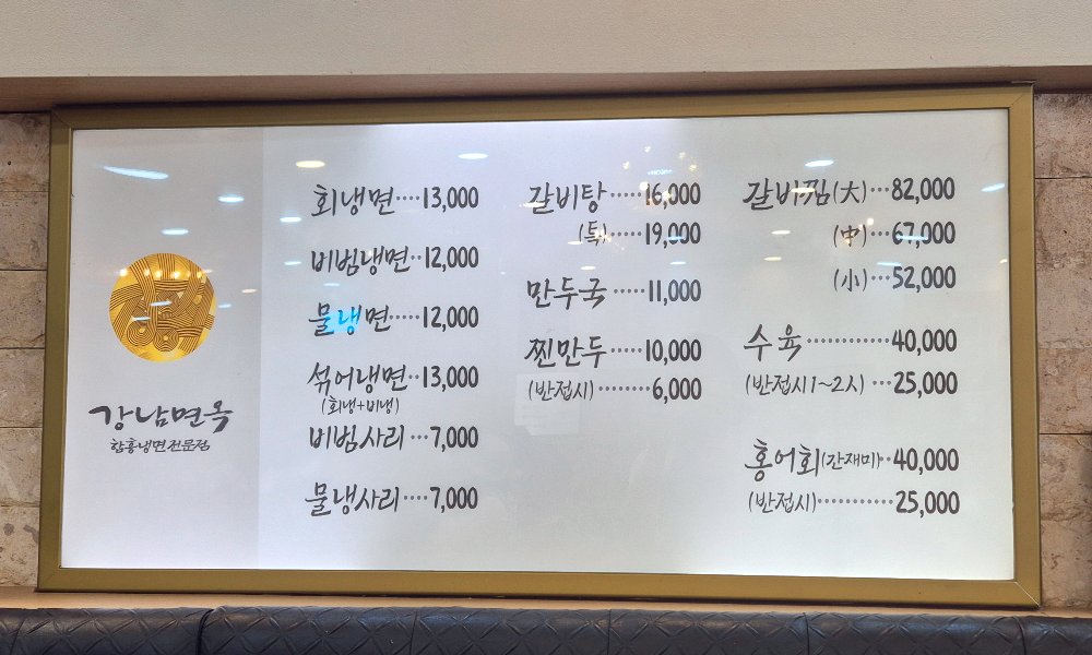 강남 면옥은 냉면이 주 메뉴이고, 만두나 수육 같은 것도 팔고 있습니다:)