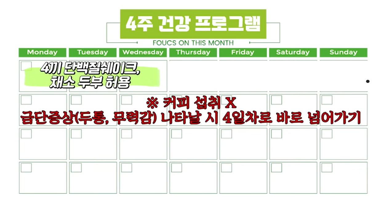 1~3일차는 단백질 쉐이크만 먹기 때문에 탄수화물 섭취가 없어, 근력 운동이 근력의 손상으로 이어집니다.