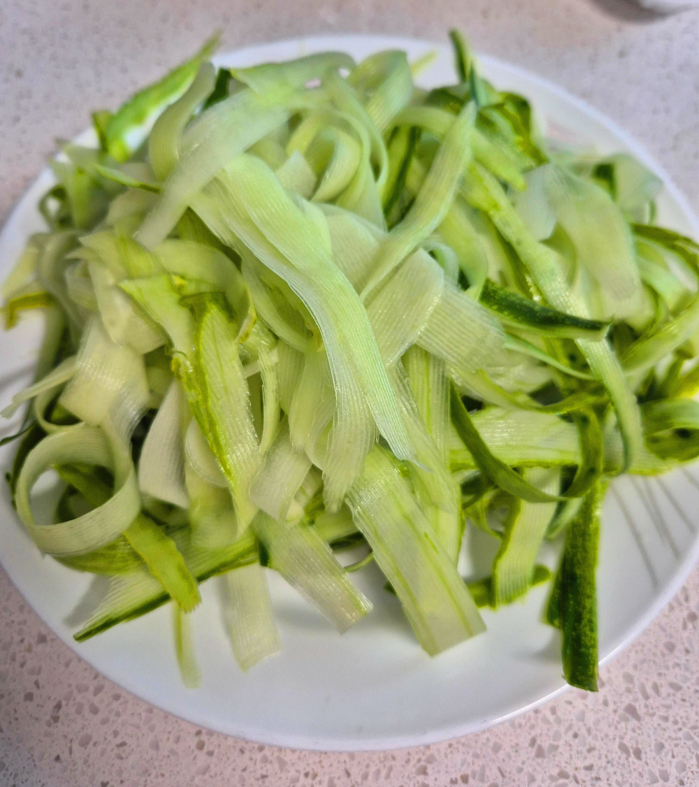 오이가 오른쪽 사진처럼 얇아질 때까지 벗겨주시면 되는데, 속으로 많이 넣으실 분들은 더 벗겨주셔도 됩니다:)