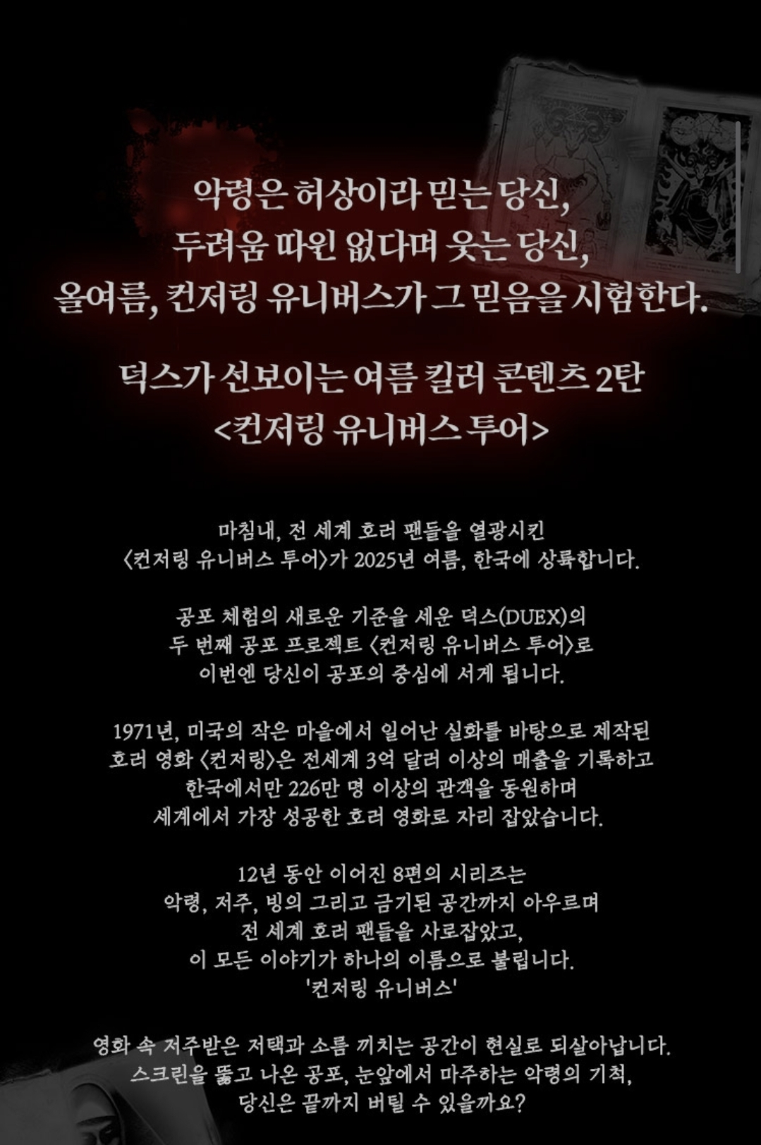 안녕하세요! 오늘은 무더운 여름에 어울리는 컨저링 유니버스 투어 전시회에 대해 포스팅하려고 합니다:)