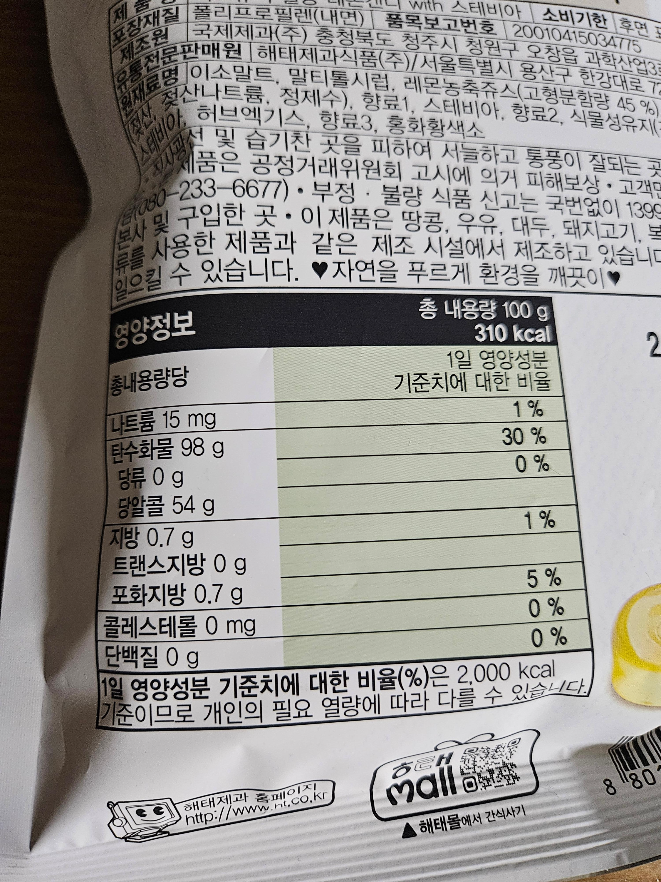 또한 전체 한 봉지에 들어있는 탄수화물이 약 100g 인 것이기 때문에 사탕 하나에 들어가 있는 영양 성분은 거의 제로라고 보실 수 있어요.