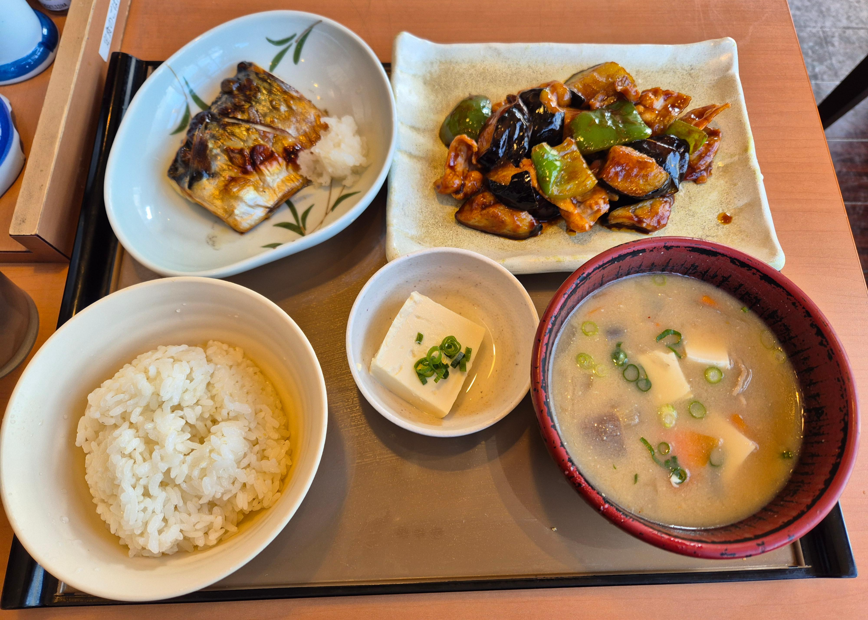 저는 가지,피망 고기 볶음+생선 정식에 톤지루를 시켜서 먹었습니다!